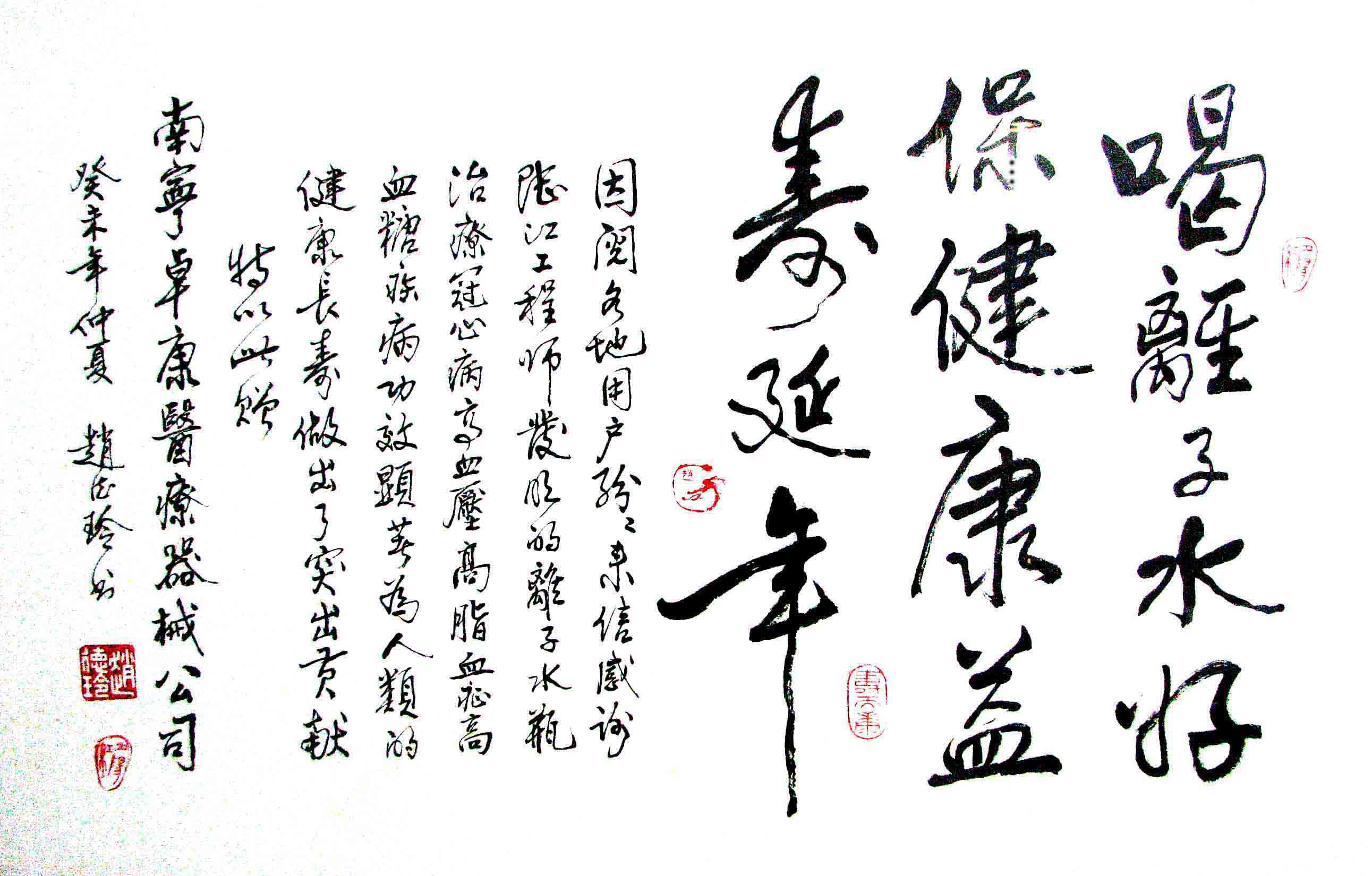 ---本品處理水用核磁共振測定值為55.82Hz(赫茲),為富含4-6個水分子小簇團的微小分子團水,可與世界各地長壽村水媲美。本品曾經三家省級醫(yī)院做臨床觀察,經北京和廣西醫(yī)學專家鑒定,22年來對以上病癥承諾療效,大量原發(fā)性高血壓患者飲用4至6個月內停藥,血壓正常穩(wěn)定,癥狀消除,逐漸逆轉至消除動脈粥樣硬化;冠心病患者在3至5個月內逐漸減輕至消除心痛胸悶,一年左右痊愈,心腦電圖正常。這是根據(jù)中國基礎醫(yī)學研究成果和生命科學原理轉化為醫(yī)學應用的杰出成果,使人從細胞到器官發(fā)展至全身健康。2型糖尿病患者使用3-10月內痊愈。中風后遺癥患者7-10個月改善至消除肢體和語言障礙。用戶最新報告:尿毒癥患者飲用兩個月,指標已經大為改善,適合腎衰和透析者使用。以上均為史無前例的轉化醫(yī)學應用,產品壽命30年,不換芯。