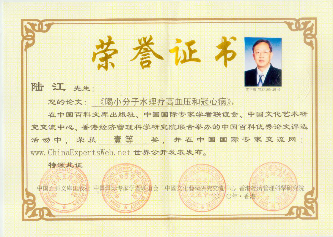 -----我是從事建筑的高工,本來沒有資格去攻克醫(yī)學難題,卻為了自身健康才扣響醫(yī)學的大門。由于我1990年患高血壓,因怕中風才研究發(fā)明了離子水瓶,我把水處理成微小分子團水,飲用后治愈了高血壓。便于1993年底送到三家省級醫(yī)院做臨床試用4個月。經北京和廣西醫(yī)學專家鑒定:"降脂降壓效果好"," 能擴大心腦動脈流量,改善心腦電圖以及微循環(huán)","對治療心腦動脈粥樣硬化、高血壓、高血脂有良好的醫(yī)療保健作用。""產品的技術性能和療效達到了同類產品的國內領先水平,經廣西醫(yī)學科學情報研究所檢索,未見國外有類似報道。"中國醫(yī)學科學院張正國教授從美國國立醫(yī)學圖書館數(shù)據(jù)庫存Medline檢索英俄文資料,均未見類似報告。2000年上市后,我為了對消費者負責而繼續(xù)觀察研究,一直通過《信譽卡》和《質量跟蹤調查書》向患者承諾療效,請用戶使用6個月后反饋效果。和脂壓患者飲用2至5個月內,消除癥狀,停服藥物,血壓正常;冠心病患者飲用3~5個月逐漸減輕至消除心絞痛、房顫等癥狀,不再服藥,飲用1年左右心電圖正常,經冠脈造影掃描無明顯狹窄,表明冠心病痊愈。大量患者還反映許多衰弱器官被修復,讓前列腺增生、慢性咽喉炎、慢性氣管炎、支氣管炎、慢性胃炎、腸炎和膽囊炎等不藥而愈;2型糖尿病患者是因為胰島衰弱致病,飲用該水半年至一年,逐漸減藥至停藥,血糖尿糖正常,真正治愈2型糖尿病。中風后遺癥患者飲用六七個月,可逐漸減輕至消除肢體和語言障礙,表明飲用該水能讓壽命很長的神經元細胞逐漸修復,奇跡般地恢復肢體和語言功能。飲用后還使胸腺和脾臟兩個重要的免疫器官被修復和增強,產生免疫細胞多,提高了免疫力,使人不生病或少生病。自此, 飲用微小分子團水創(chuàng)造了攻克冠心病、高(低)血壓和糖尿病三大醫(yī)學難題的奇跡。人們對此感到不可思議,但實踐是檢驗真理的唯一標準。